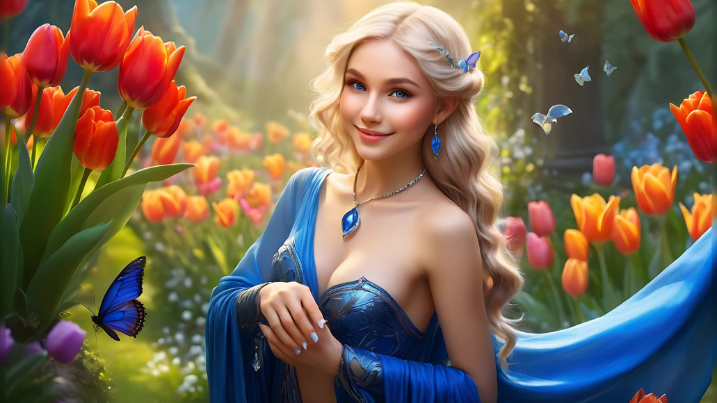 LustRender: 12. Tulip'i gülümseyerek tutuyor, safir-mavi elmas takı giyiyor